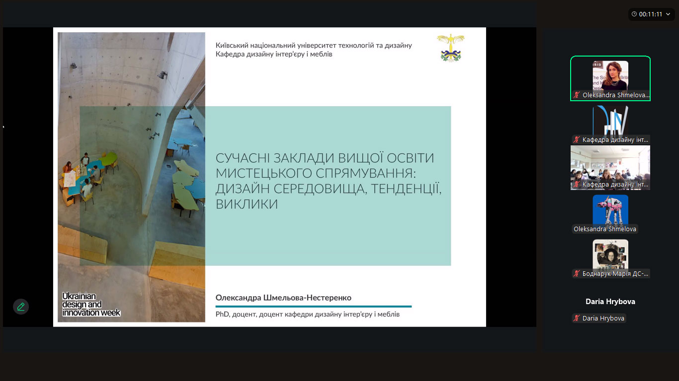 3 жовтня 2025 року в межах Тижня дизайну КНУТД відбулася лекція Олександри Шмельової-Нестеренко, доктора філософії, доцента кафедри дизайну інтер’єру і меблів КНУТД, на тему «Сучасні заклади вищої освіти мистецького спрямування: дизайн середовища, тенденції, виклики».