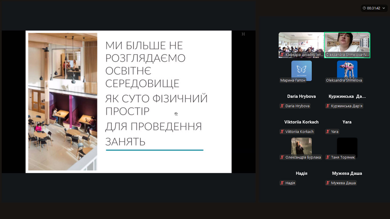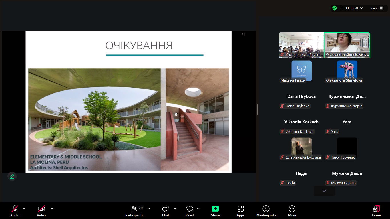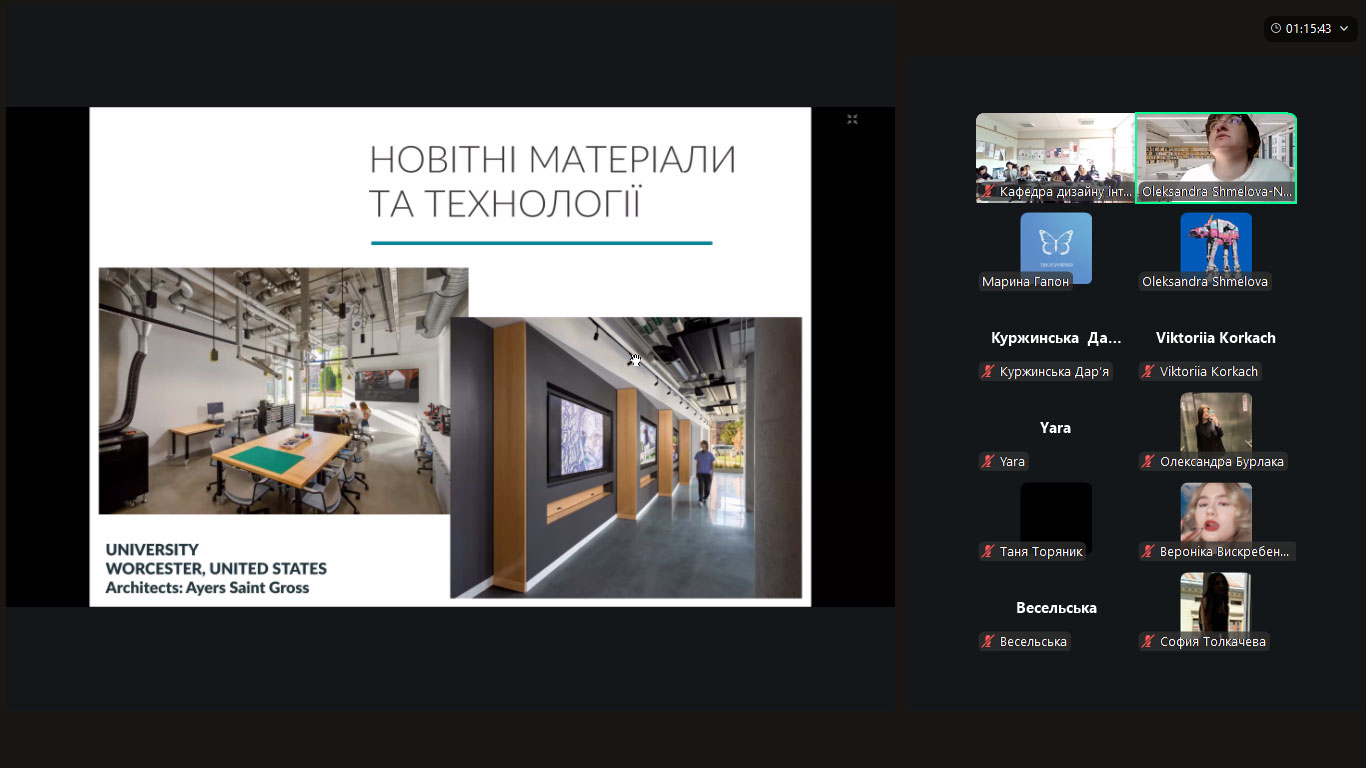 На лекції також було продемонстровано низку реалізованих закордонних проєктів, які демонструють останні тенденції в галузі дизайну середовища обговорюваних закладів вищої освіти.