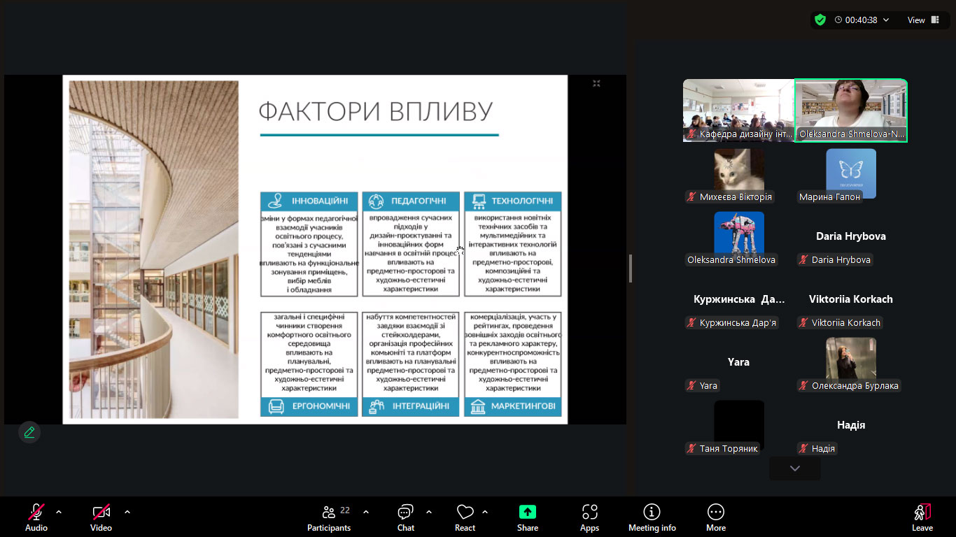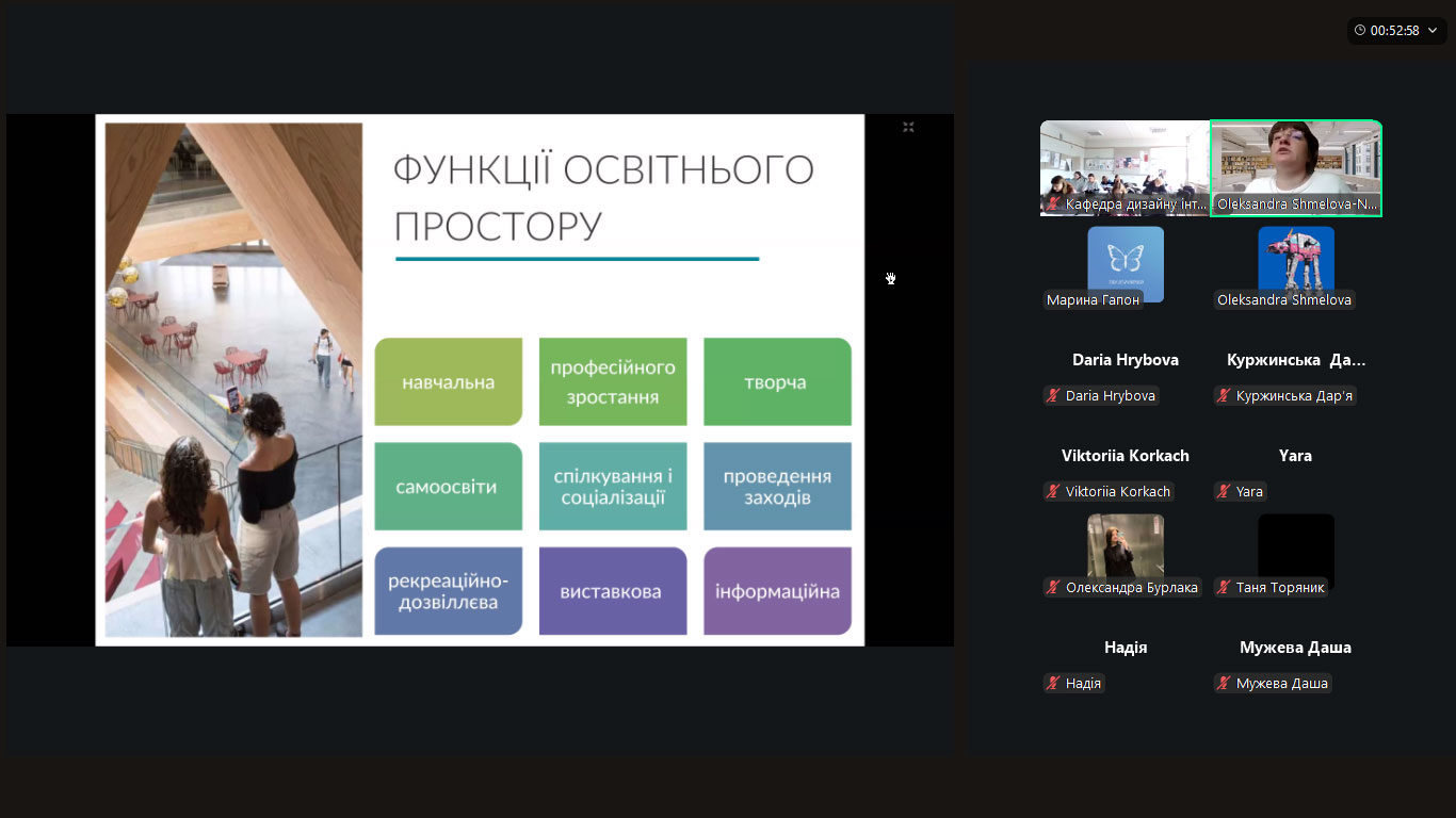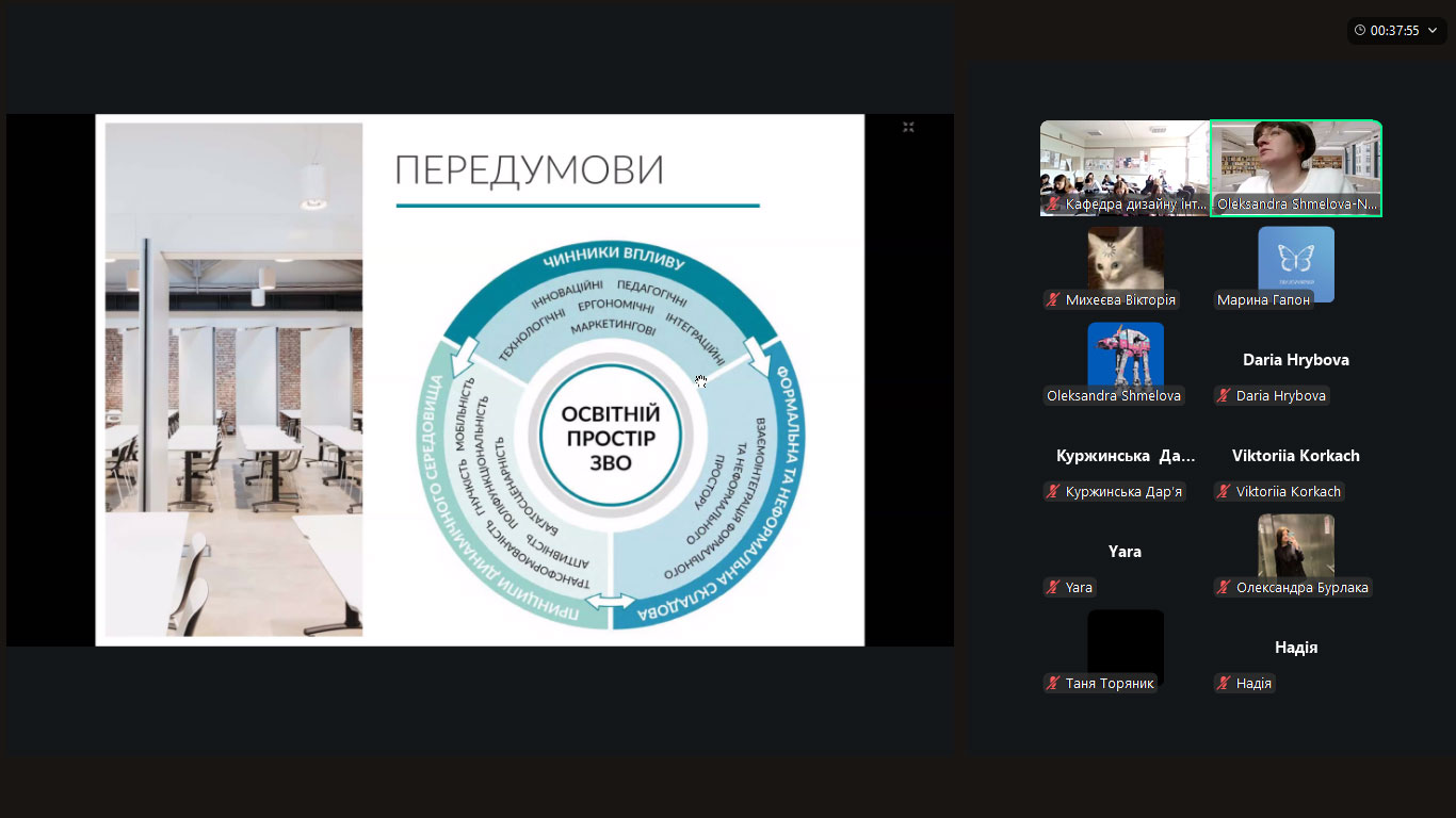 На лекції також було продемонстровано низку реалізованих закордонних проєктів, які демонструють останні тенденції в галузі дизайну середовища обговорюваних закладів вищої освіти.