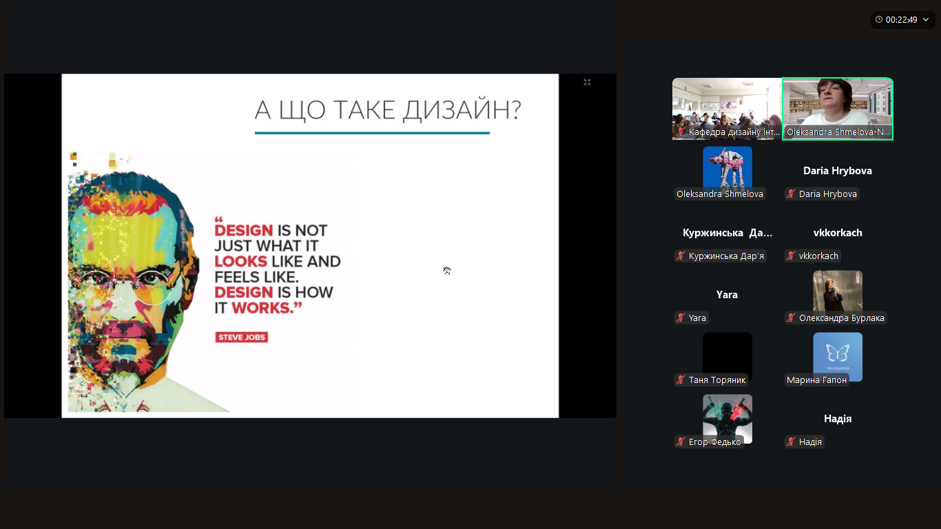 Захід зібрав багато учасників – викладачів і студентів КНУТД, а також учасників Тижня українського дизайну та інновацій, а також представників інших закладів вищої освіти України. Лекція проходила в онлайн форматі, що не завадило зробити захід цікавим та атмосферним.