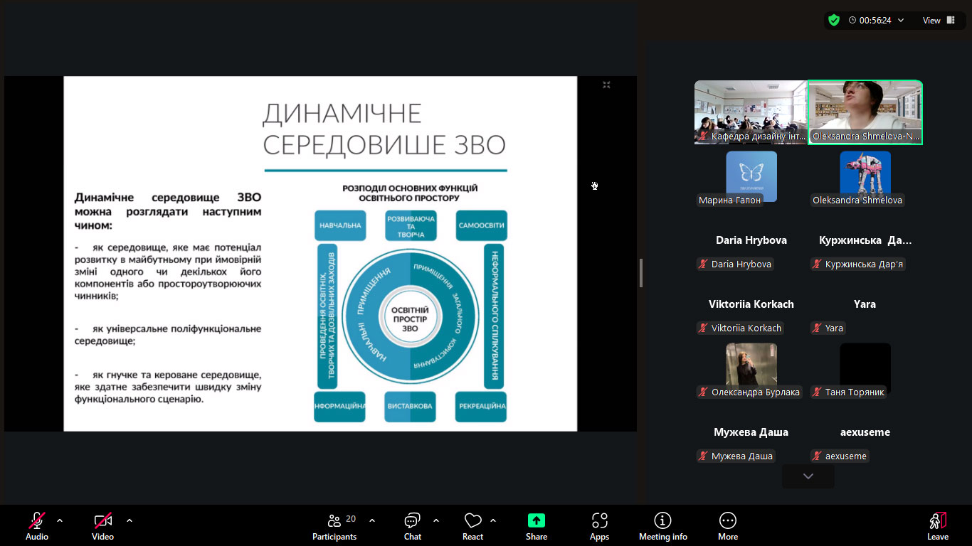 Впродовж лекції слухачі мали змогу ознайомитись, як з останніми світовими тенденціями в дизайні середовища закладів вищої освіти мистецького спрямування, так і з основними проблемами цієї галузі на території України. Доцент Олександра Шмельова-Нестеренко розповіла які передумови необхідні для формування середовища освітнього простору ЗВО та які основні фактори впливають на дизайн середовища.
