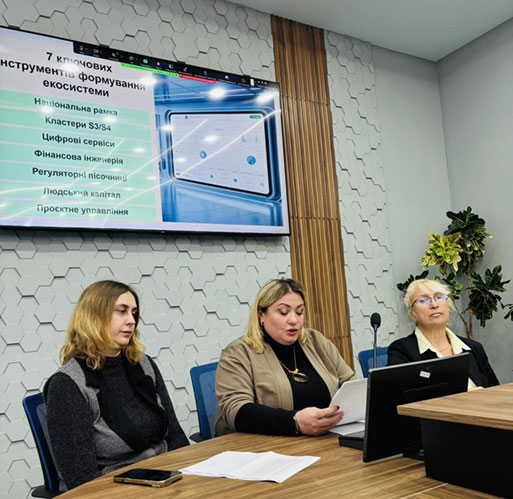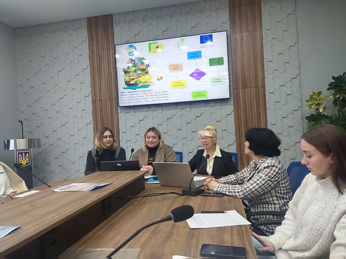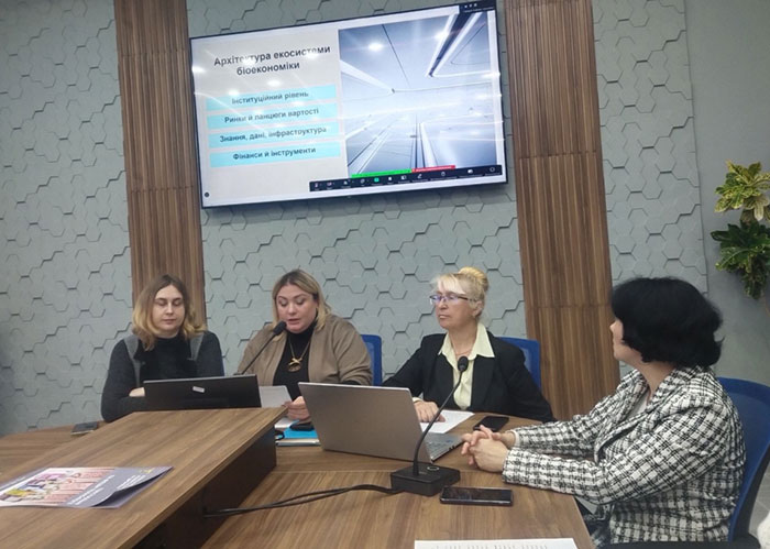 Координатор проєкту Поліна ПУЗИРЬОВА, доктор економічних наук, професор, завідувач кафедри економіки, представила доповідь на тему «Перспективи формування екосистеми економіки України на засадах біоекономіки», де зазначила про стратегічний шлях до сталого розвитку через інновації, відновлювані ресурси та технологічну модернізацію. Вона наголосила на тому, що біоекономіка для України – це стратегічна економічна модель, яка здатна забезпечити стійке післявоєнне відновлення, декарбонізацію й технологічне оновлення.