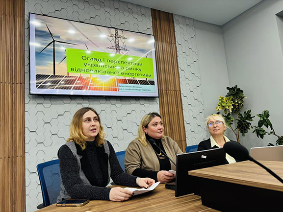Спікер Світлана БЕБКО, доктор економічних наук, професор, професор кафедри маркетингу, виступила з доповіддю на тему «Огляд і перспективи українського ринку відновлюваної енергетики» та розповіла про відновлювані джерела енергії як чинник енергетичної незалежності України. Вона наголосила на подальшому розвитку відновлюваних джерел енергії, що може сприяти гнучкості та стійкості енергетичної безпеки України та значним соціально-економічним й екологічним вигодам післявоєнної відбудови країни та її євроінтеграції.
