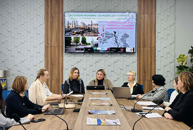 Людмила МЕЛЬНИК, доктор філософії з економіки, доцент кафедри економіки представила доповідь на тему «Циркулярна економіка для управління відходами у воєнний час» на прикладі Бучанського району.