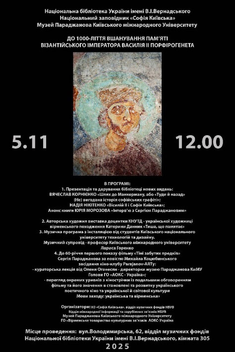 5 листопада 2025 року у Національній бібліотеці України імені В. І. Вернадського відбувся масштабний культурно-науковий захід, присвячений 1000-літтю вшанування пам’яті Візантійського імператора Василія II Порфірогенета. Програма організована у співпраці з Національним заповідником «Софія Київська», Музеєм Параджанова Київського міжнародного університету, а також Київським національним університетом технологій та дизайну, що стане важливою платформою для дослідження тисячолітніх українсько-вірменських історичних і культурних зв’язків. До вітального слова, зокрема відкритті виставки долучилися з концертним номером науково-педагогічні працівники та здобувачі освіти спеціальності В6 «Перформативні мистецтва» кафедри сценічного мистецтва і культури Факультету культури і культурних індустрій.
