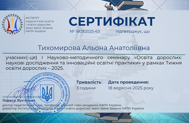 У рамках Тижня освіти дорослих – 2025, який традиційно організовує Інститут педагогічної освіти і освіти дорослих імені Івана Андрійовича Зязюна НАПН України, викладачі кафедри професійної освіти у сфері технологій та дизайну Київського національного університету технологій та дизайну долучилися до роботи І Науково-методичного семінару «Освіта дорослих: наукові дослідження та інноваційні освітні практики». Захід відбувся 18 вересня 2025 року та об’єднав педагогів, науковців і дослідників, які працюють у галузі освіти дорослих.