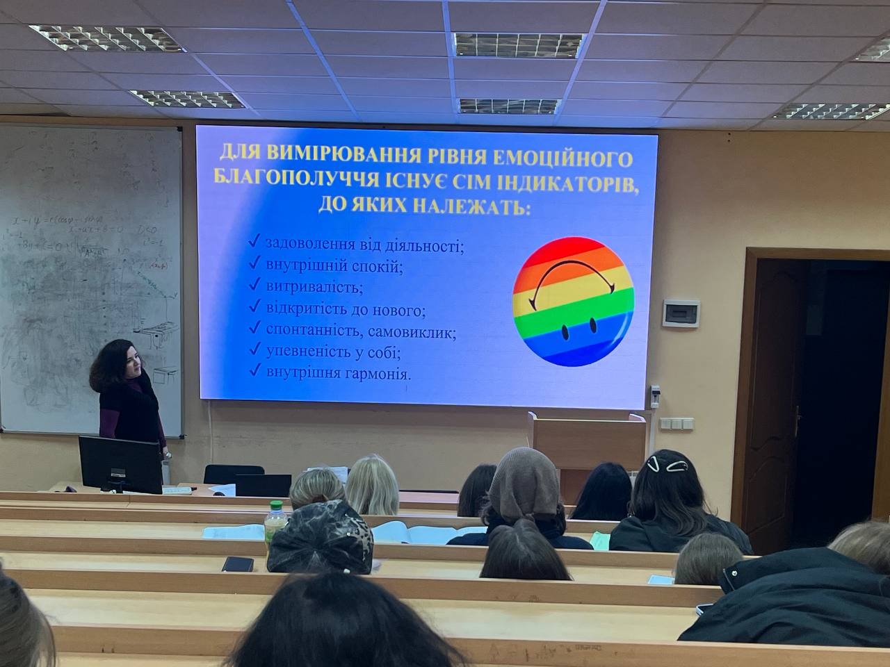 Саме тому Альона Тихомирова, старший викладач кафедри ПОСТД, кандидат психологічних наук, підготувала і провела профілактичний захід «Моє емоційне благополуччя».