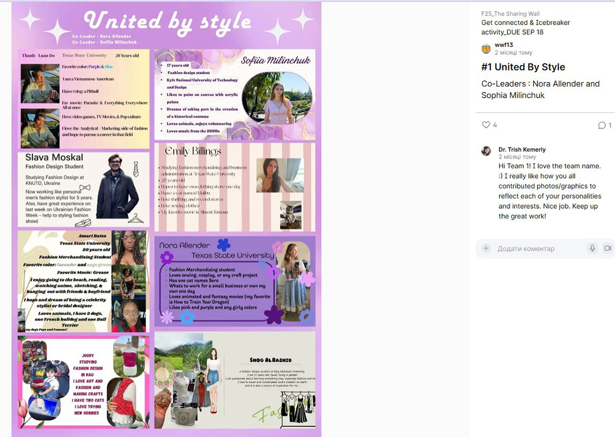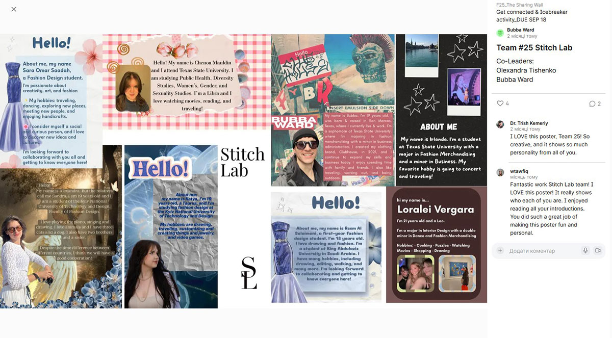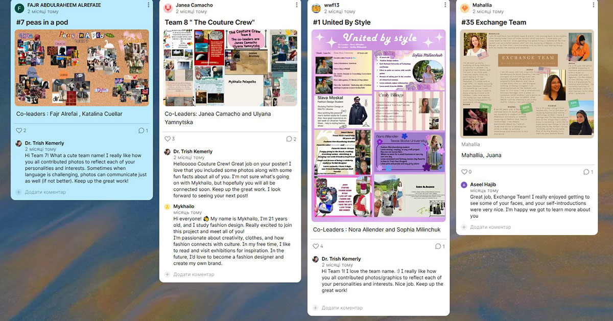 Дякуємо Косетт Джойнер Мартінез, ініціатору проєкту, професору Техаського державного університету, та колегам з інших закладів за співпрацю і можливість для студентів-дизайнерів КНУТД долучитись до міжнародної академічної мобільності!