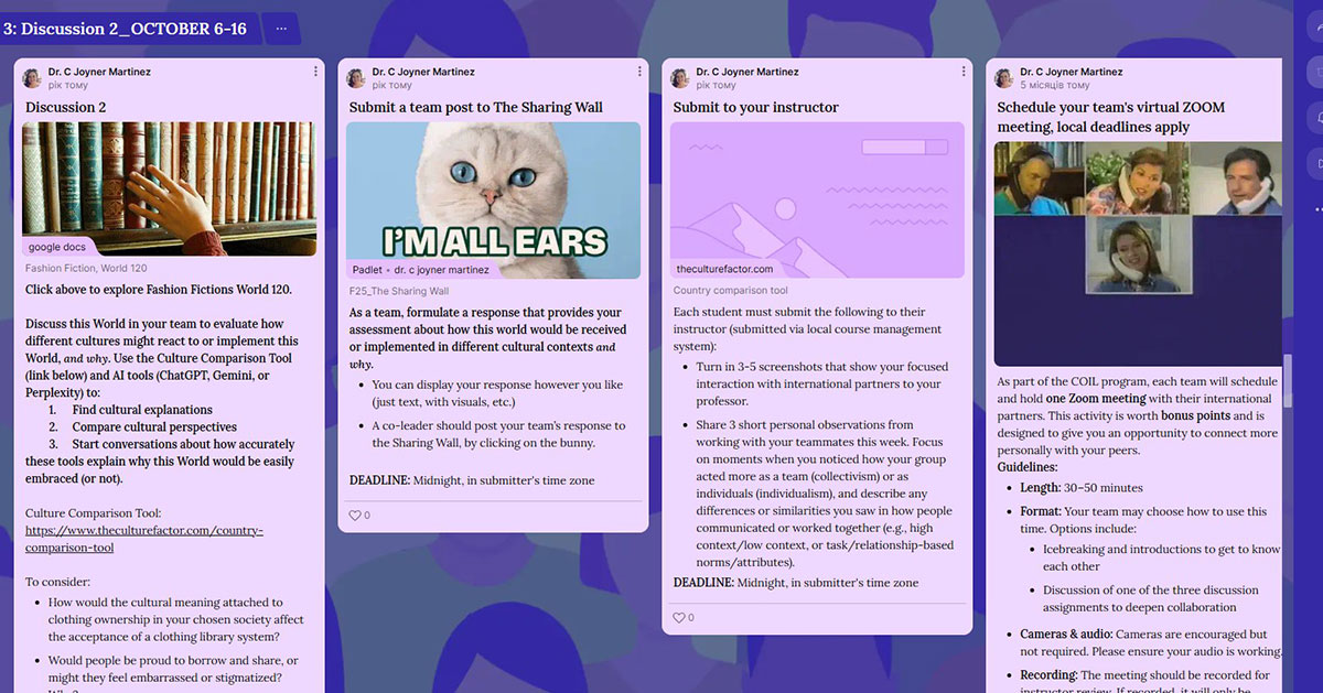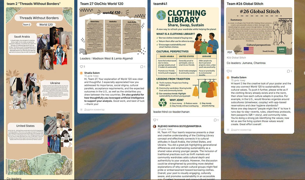 Завершився черговий проєкт міжнародної академічної онлайн мобільності (Collaborative Online International Learning (COIL)) "THE GOOD LIFE WITH CLOTHES", який об’єднав студентів і викладачів факультету дизайну КНУТД (Україна), Техаського державного університету, Університету Грінсборо в Північній Кароліні (США), Університету Короля Абдул Азіза, Університету принца Саттама бін Абдулазіза (Саудівська Аравія).