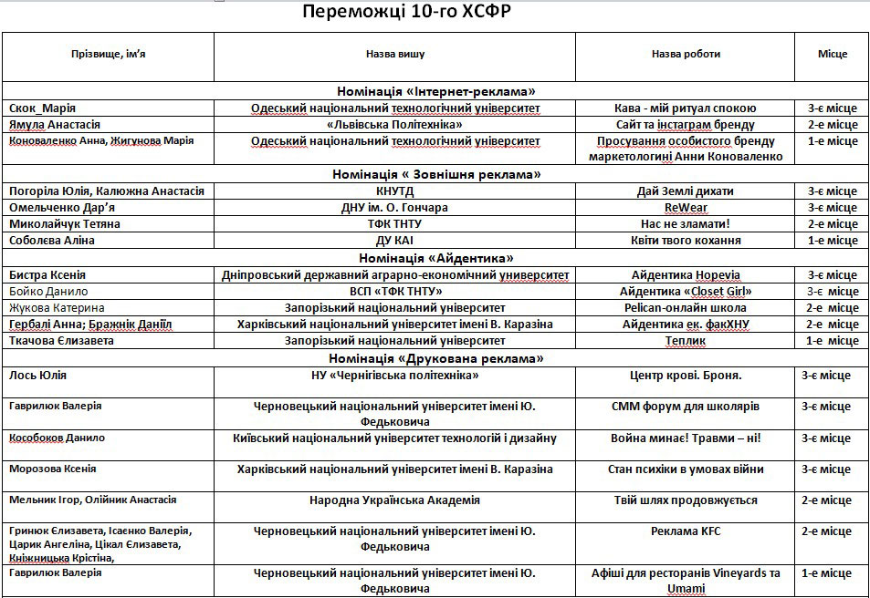 Здобувачі вищої освіти кафедри маркетингу Київського національного університету технологій та дизайну гідно представили університет, виборовши призові місця та підтвердивши високий рівень професійної підготовки здобувачів освіти спеціальності D5 «Маркетинг». Конкурсна програма ХСФР охоплювала кращі рекламні роботи студентів із різних регіонів України - Києва, Львова, Одеси, Харкова, Дніпра, Полтави, Чернівців, Тернополя, Рівного, Вінниці та інших міст. Учасники також мали можливість долучитися до циклу професійних майстер-класів від провідних експертів індустрії, а саме:
