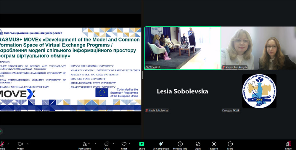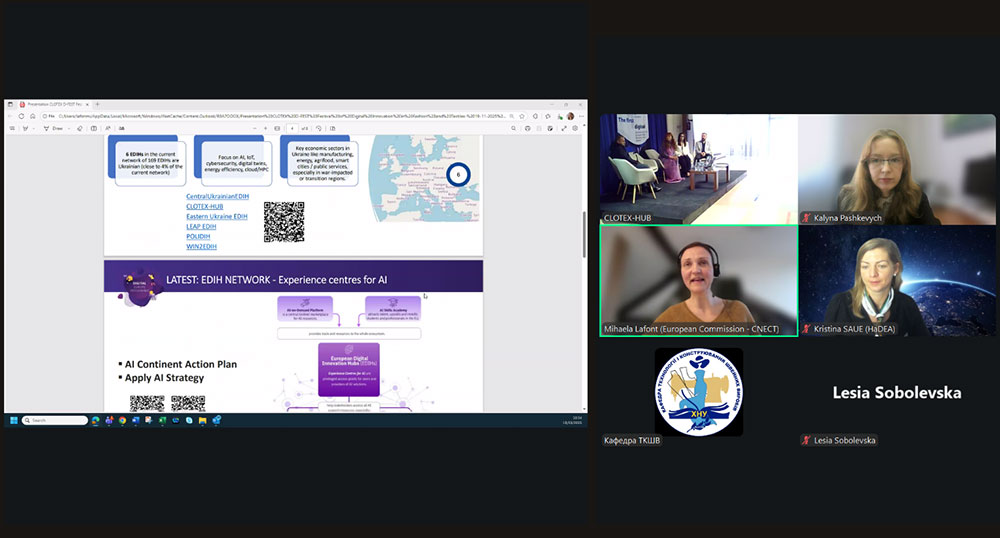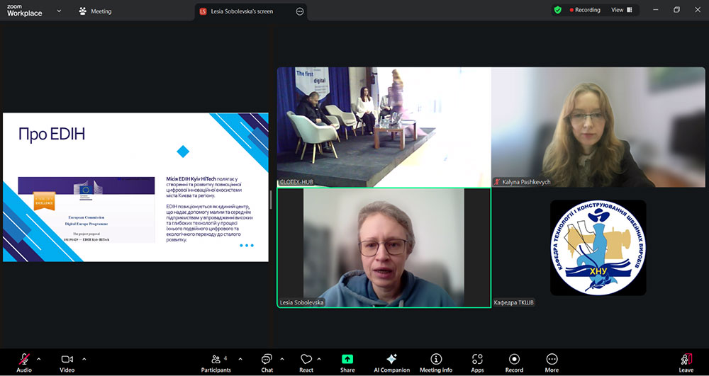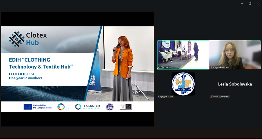 Науковці КНУТД, виконавці проєкту ERASMUS+ INNOVATEX, за запрошенням Оксани Захаркевич, начальника науково-дослідної частини ХНУ, координатора проєкту EDIH CLOTEX-HUB, доктора технічних наук, професора, презентували проєкт на дискусійній платформі "Синергія проєктів: Erasmus, Horizon Europe, Digital Europe".