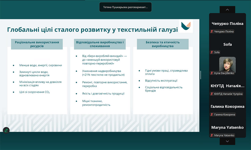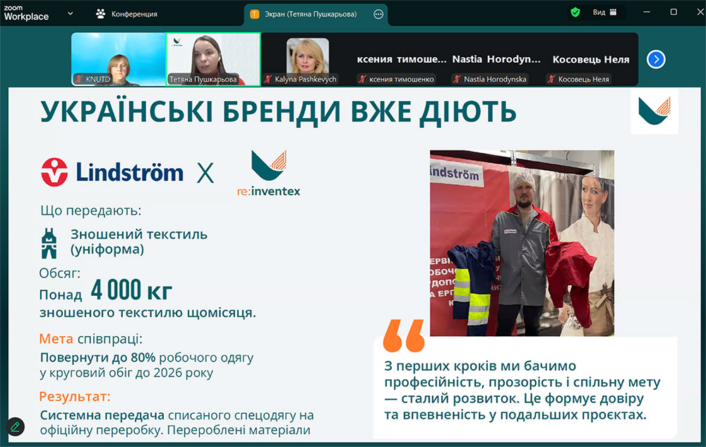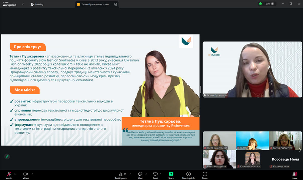 Тетяна Пушкарьова поділилась власним досвідом роботи у модній індустрії та можливостями поєднання майстерності з сучасними принципами сталого розвитку, представляючи моду крізь призму відповідального дизайну та циркулярної економіки. Спікер ознайомила з вимогами до екодизайну, напрямками переробки текстилю, основними законодавчими актами, що спрямовані на запобігання утворенню текстильних відходів, розширення відповідальності виробника за вироби упродовж життєвого циклу та підкреслила важливість етапу дизайну текстильних виробів для подальшої можливості їх переробки.