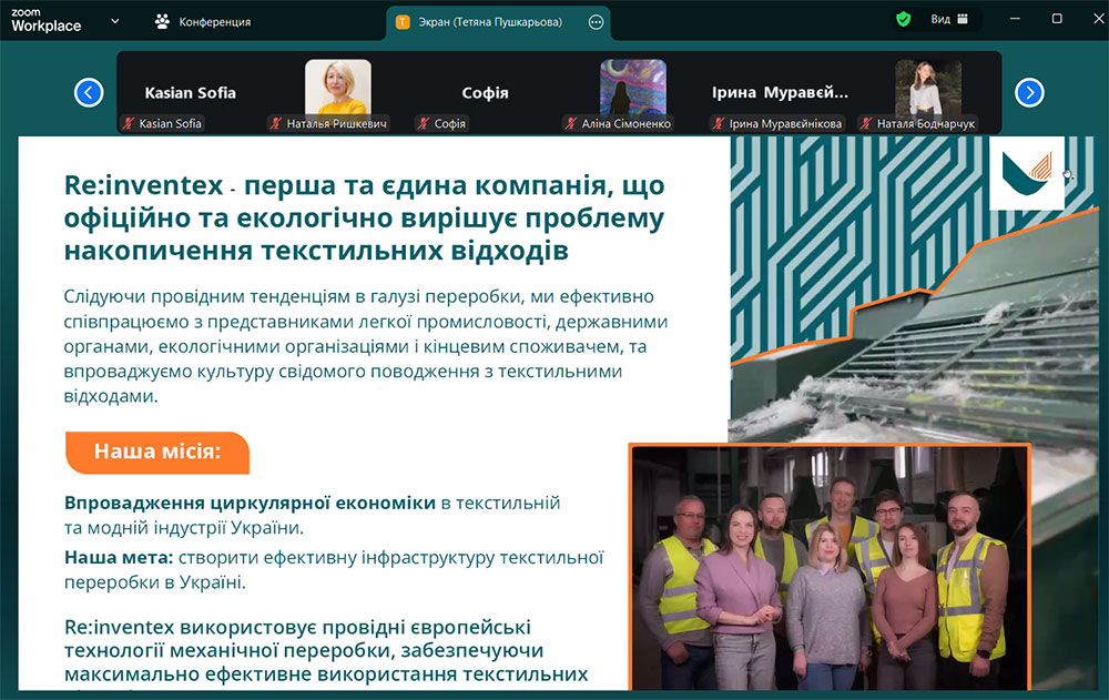27 листопада 2025 року в рамках реалізації проєкту «SusWearTex: співробітництво Балтійських держав у ініціюванні розвитку сталого робочого одягу – використання переробленого волокна в текстильному виробництві робочого одягу» відбулась зустріч з Тетяною Пушкарьовою, менеджеркою по розвитку компанії Re:inventex. Підприємство Re:inventex є лідером сталого розвитку у текстильному виробництві та безвідходному використанні текстильних ресурсів.