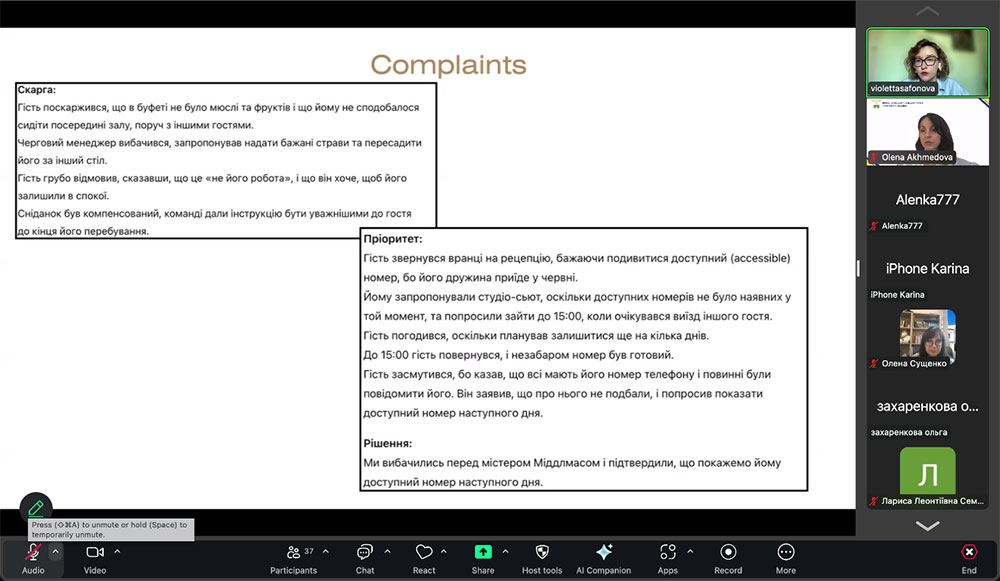 Важливою частиною зустрічі став практичний огляд використання системи Opera для керування готелем, обробки спеціальних запитів та персоналізованих побажань. На реальних кейсах були розглянуті ситуації щодо опрацювання скарг гостей, організації компенсацій, реагування на невдоволення якістю послуг або умовами перебування, а також підкреслено, як такі рішення впливають на репутацію готелю.