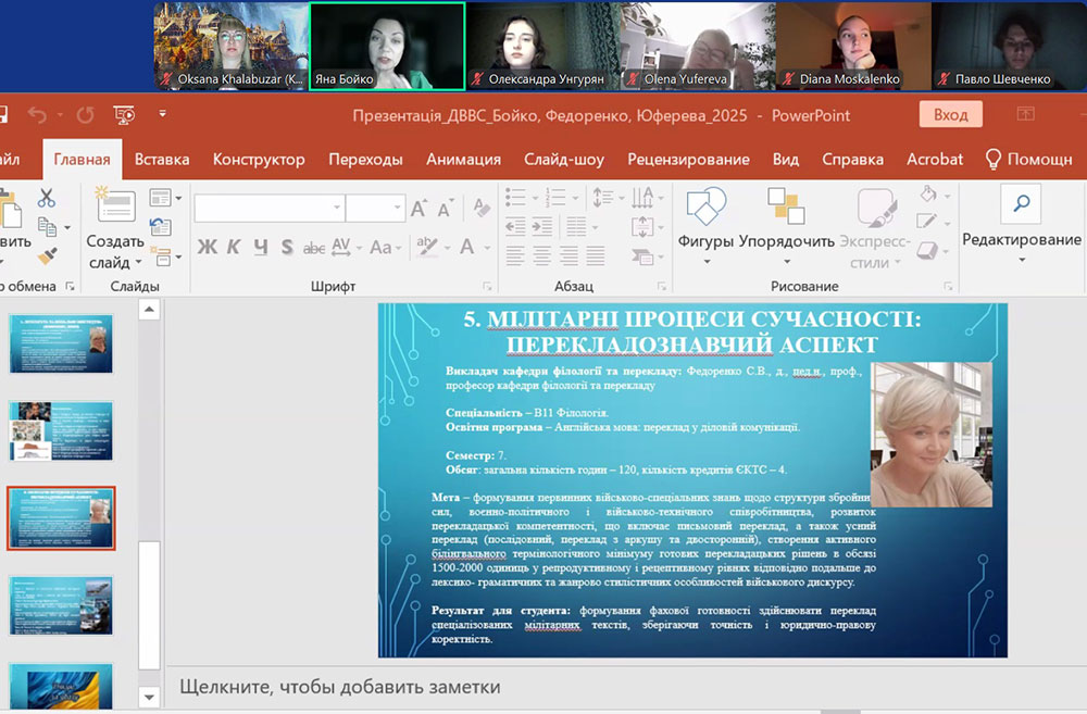 У ході обговорення було окреслено перспективні напрями подальшого вдосконалення освітніх компонентів, зокрема в частині більш гнучкого поєднання теоретичного змісту з практично орієнтованими формами роботи, розширення використання прикладних кейсів, проєктних завдань та сучасних цифрових інструментів, що відповідають актуальним запитам професійної діяльності перекладача.