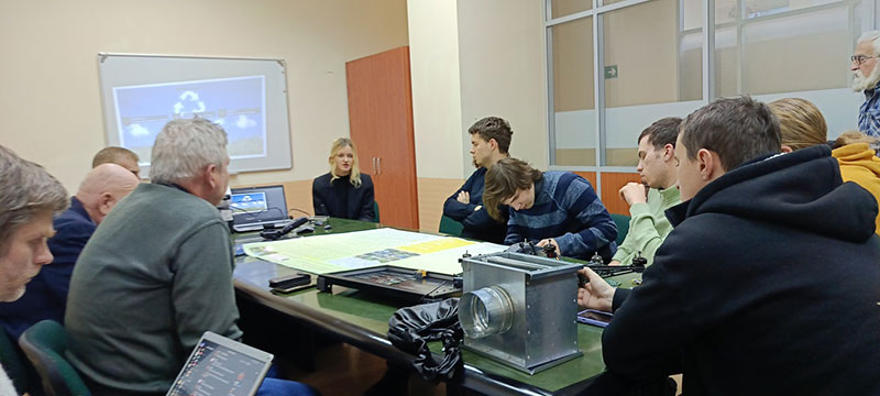 Технік кафедри прикладної фізики та вищої математики Цвєркунова Анастасія представила прототип багатошарового фільтру для замкнених приміщень. Під час доповіді вона отримала ряд цікавих питань та порад, які допоможуть вдосконалити прототип і перейти до його прямих випробувань в реальних умовах.