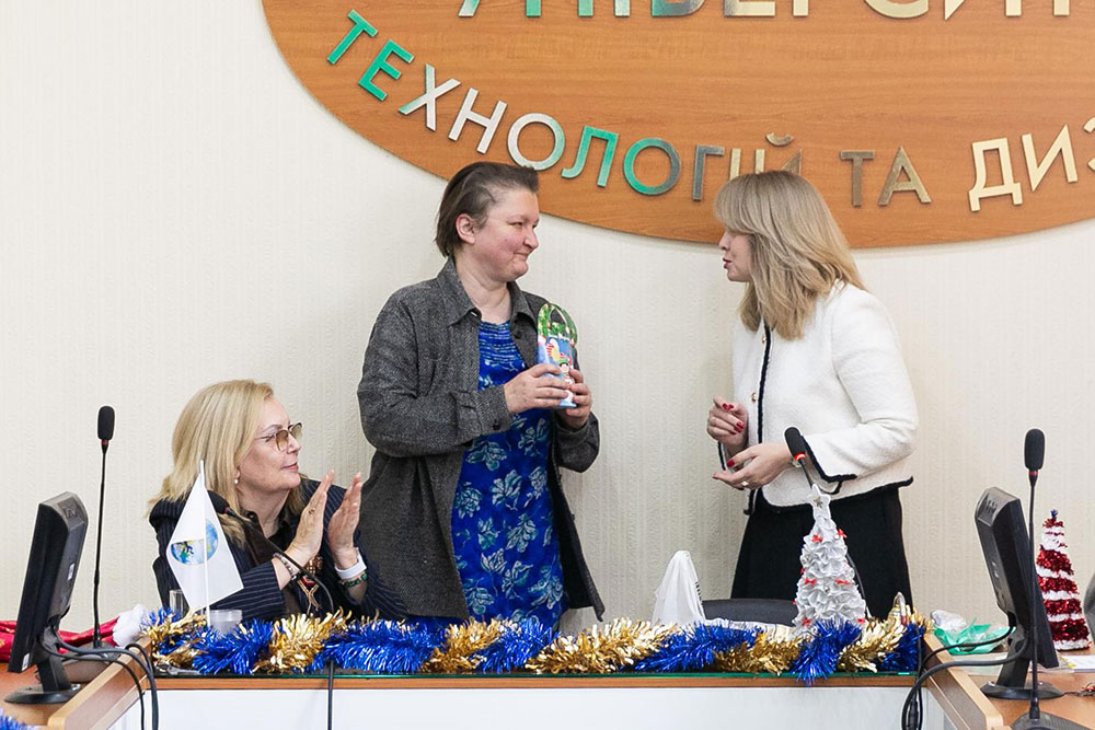 Людмила Михайлівна Ганущак-Єфіменко, проректор з наукової та міжнародної діяльності, доктор економічних наук, професор, відмітила науковий потенціал факультету дизайну, наукові проєкти, які реалізують науковці факультету, високу публікаційну активність викладачів і аспірантів, результативність аспірантури за спеціальністю «Дизайн» та побажала членам колективу успіхів, нових проєктів, розвитку і процвітання в Новому році.