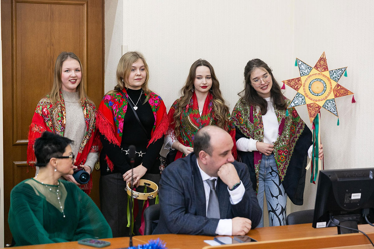 Талят Енверович Бєлялов, проректор з науково-педагогічної діяльності та виховної роботи, доктор економічних наук, професор, привітав всіх присутніх з Різдвом Христовим та Новим роком, підсумував здобутки 2025 року щодо покращення матеріальної бази та умов проживання студентів, розповів про перспективи розвитку в цьому напрямі.