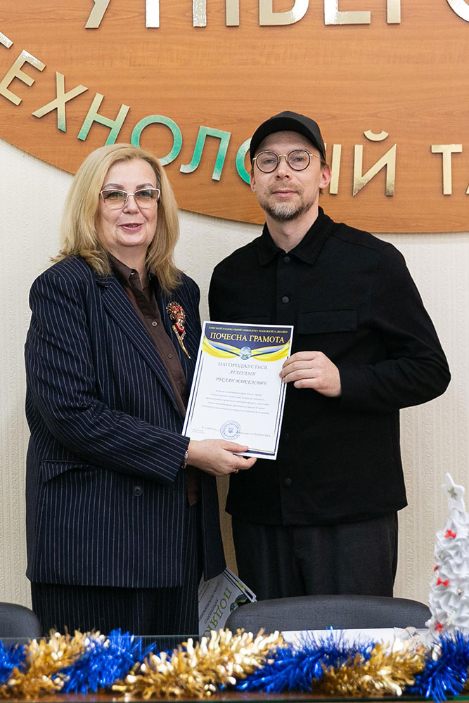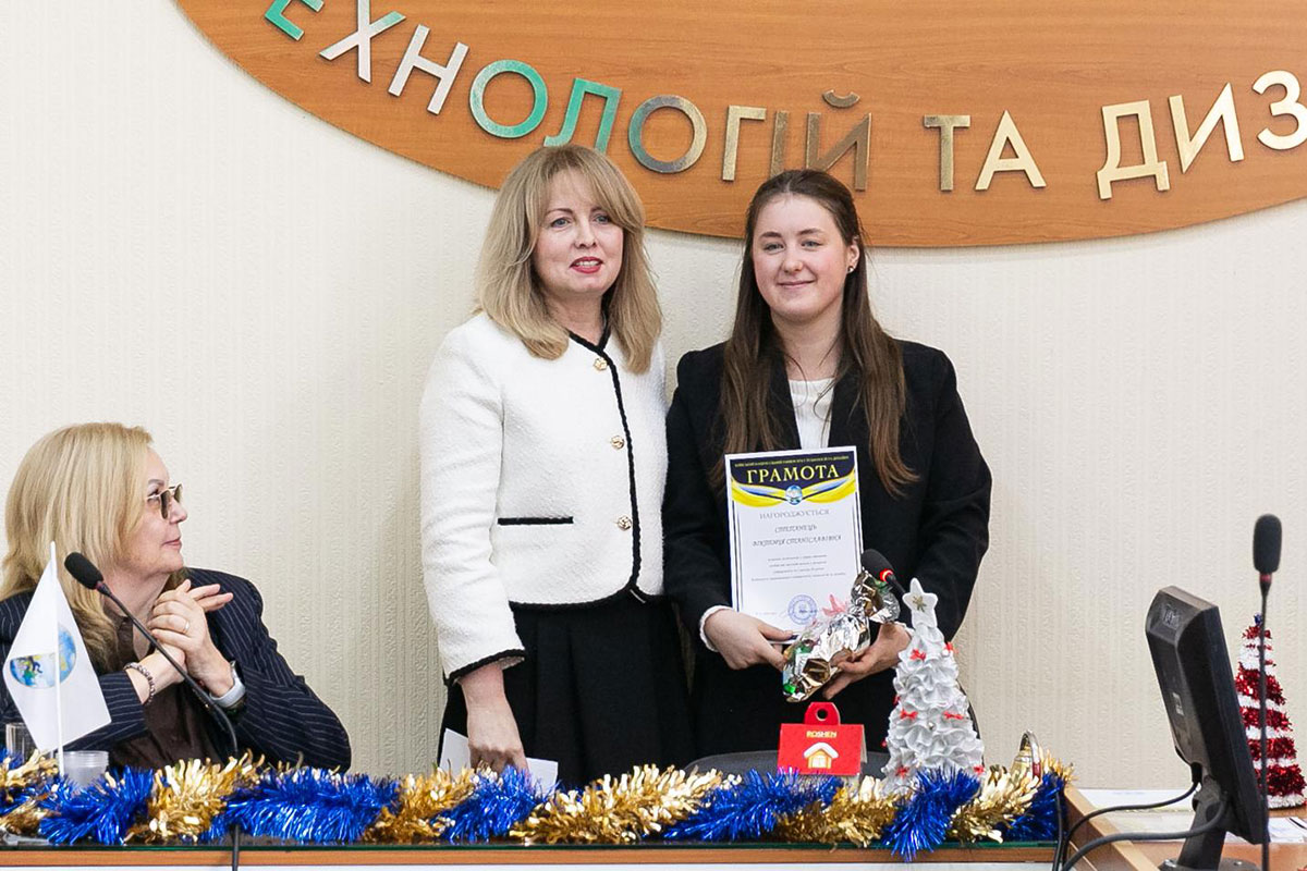 Олександра Ольшанська, в.о. ректора КНУТД, Калина Пашкевич, декан факультету дизайну та Вікторія Степанець, голова студентського самоврядування факультету дизайну відзначили активних студентів факультету грамотами та солодкими подарунками, подякували за активну громадську позицію, за допомогу в організації навчальної та позанавчальної діяльності студентів.
