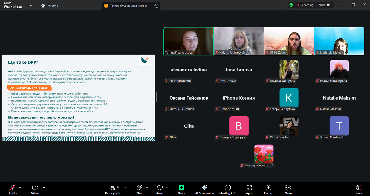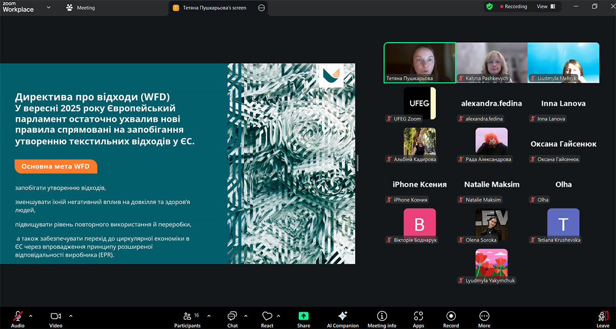 Тетяна Пушкарьова розповіла про нові вимоги ЄС до екодизайну, впровадження цифрового паспорту продукту, напрями переробки текстилю в світі, основні законодавчі акти, що спрямовані на запобігання утворенню текстильних відходів, поточний стан текстильного законодавства України, ключові прогалини та перспективи гармонізації з ЄС тощо.