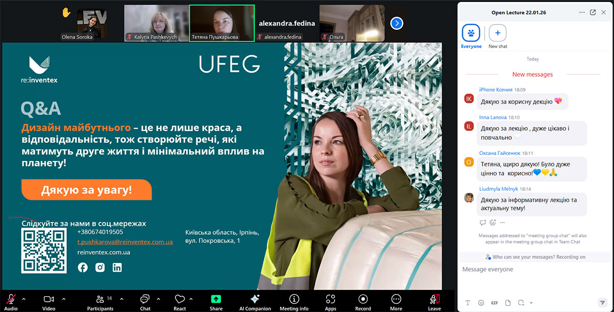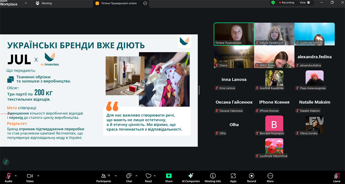 Цікавою була інформація про імплементацію відповідальної утилізації відходів текстильного виробництва в Україні. Спікерка розповіла про досвід українських підприємств, які активно долучаються до переробки відходів. Підприємство Re:inventex є лідером сталого розвитку у текстильному виробництві та безвідходному використанні текстильних ресурсів в Україні і світі та активно співпрацює з швейними та текстильними підприємствами.