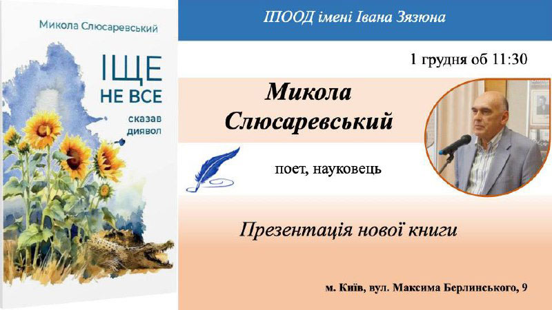 1 грудня 2025 року в Інституті педагогічної освіти і освіти дорослих імені Івана Зязюна НАПН України відбулася знакова подія для науково-освітньої та психологічної спільноти – презентація книги члена Президії Національної академії педагогічних наук України, кандидата психологічних наук, члена-кореспондента НАПН України, директора Інституту соціальної та політичної психології НАПН України Миколи Слюсаревського під назвою «Іще не все сказав диявол». У заході взяли участь представники кафедри професійної освіти в сфері технологій та дизайну, для яких участь у подібних подіях є важливою складовою професійної взаємодії з провідними науковими інституціями та стейкхолдерами освітньо-професійної програми «Психологія».
