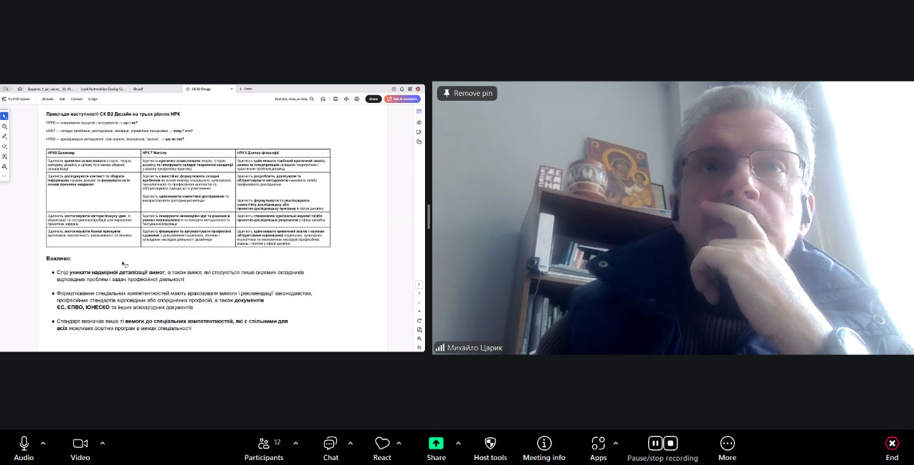 Було обговорено спеціальні компетентності стандарту спеціальності «В2 Дизайн» для бакалаврського, магістерського рівнів вищої освіти та доктора філософії і доктора мистецтва.