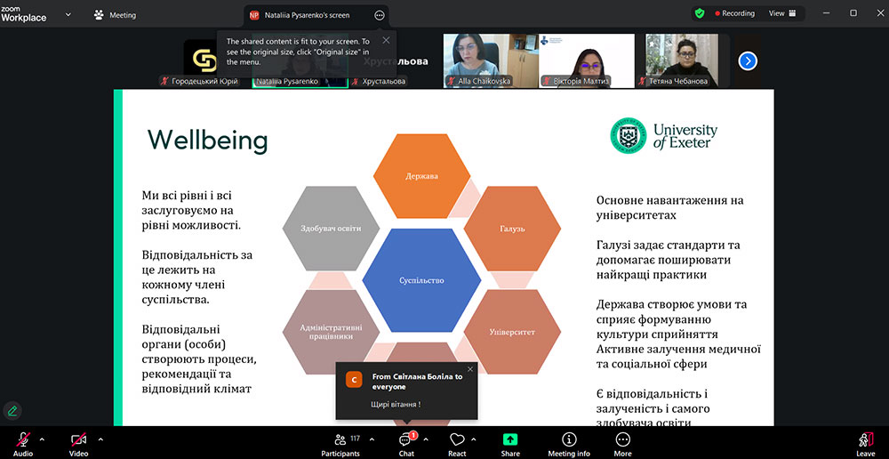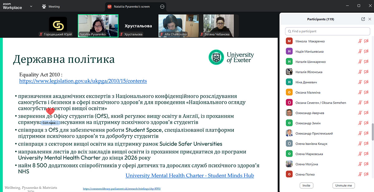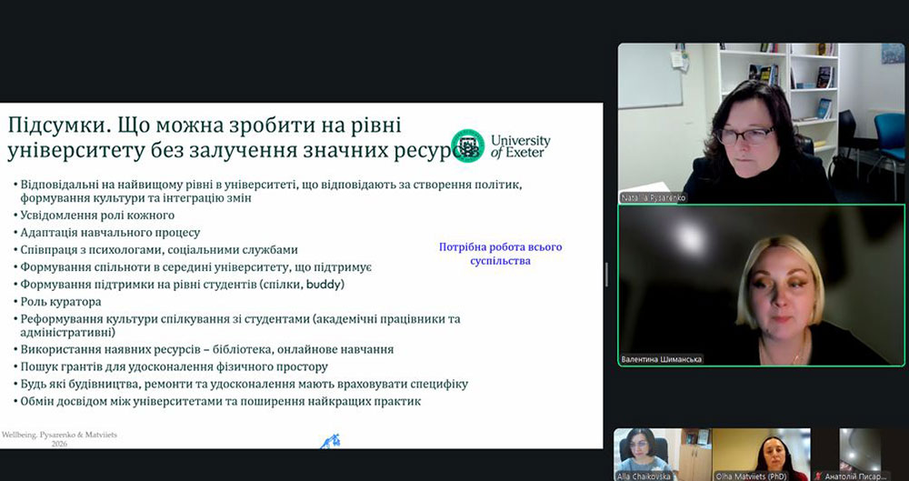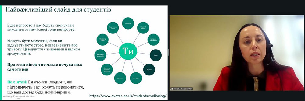 Окрему увагу під час вебінару було приділено практикам wellbeing - підтримці психоемоційного стану здобувачів. Відомо, що університети Великої Британії суттєво розширили програми ментального здоров’я та соціальної підтримки: сучасні системи студентського welfare включають професійне консультування, групову терапію, тренінги зі стрес-менеджменту, цифрові сервіси підтримки та інтеграцію заходів формату peer-to-peer. Такі комплексні підходи сприяють підвищенню залученості студентів до навчального процесу та зростанню їхньої академічної успішності.