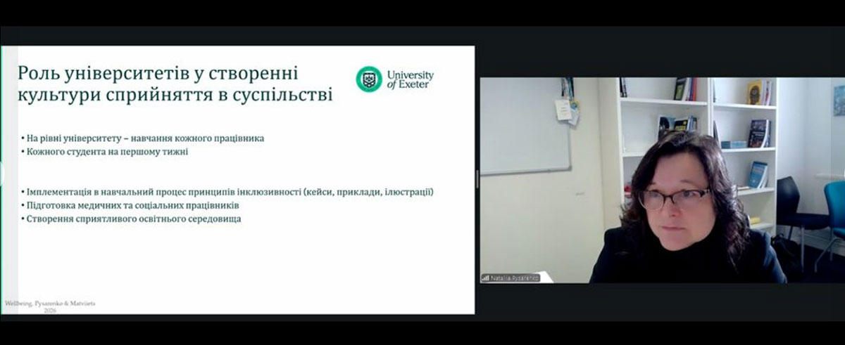 Наталія Писаренко, кандидатка економічних наук, доцентка та директорка магістерської програми Marketing and Business Analytics кафедри Business Strategy and Marketing Університету Екзітера (Велика Британія) представила аналітичний огляд сучасних освітніх практик Великої Британії, спрямованих на створення інклюзивного та підтримувального освітнього середовища для всіх студентів незалежно від їхніх індивідуальних особливостей чи соціальних обставин. У межах заходу було акцентовано увагу на широкому спектрі питань, що нині перебувають у центрі міжнародного освітнього дискурсу. Зокрема, обговорювалися принципи інклюзивної освіти як філософії та практики, згідно з якою кожен здобувач має рівний доступ до якісного навчання й можливість повноцінно реалізувати свій потенціал. У британському контексті інклюзивність визначається не лише як фізична доступність, а й як гнучкість викладання, адаптація оцінювання, підтримка ментального благополуччя та створення умов для соціальної взаємодії студентів у навчальних групах.