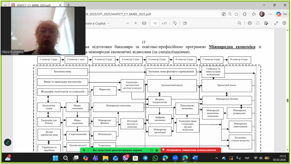 2 березня 2026 року на кафедрі економіки було проведено зустріч робочої групи освітньої програми «Міжнародна економіка» зі стейкхолдерами. Метою заходу стало обговорення актуальності структури та змісту освітньої програми, відповідності результатів навчання сучасним вимогам глобального ринку праці, а також визначення напрямів її подальшого вдосконалення.