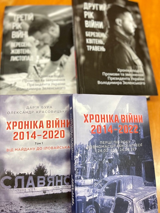 У читальній залі науково-технічної бібліотеки КНУТД триває книжкова виставка «Чорно-білі хроніки України» ‒ серія видань документальних хронік з 2014 року по осінь 2024, промов та звернень Президента України Володимира Зеленського періоду повномасштабної війни. Книги підготовлені колективом авторів-упорядників з метою нагадати читачеві про героїку, силу духу та незламність, трагічність та буденність подій війни, про те, що війна триває, і українці захищають свою незалежність та боронять Європу від «руського міра».