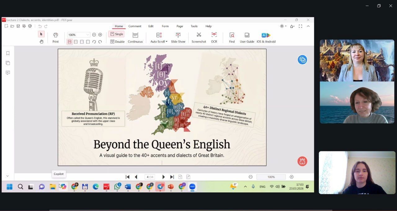 23 березня 2026 року для здобувачів вищої освіти спеціальності B11 «Філологія» освітньої програми «Англійська мова: переклад у діловій комунікації» КНУТД відбулася відкрита гостьова лекція на тему «Accents, dialects, and identities: the voice of Britain».
