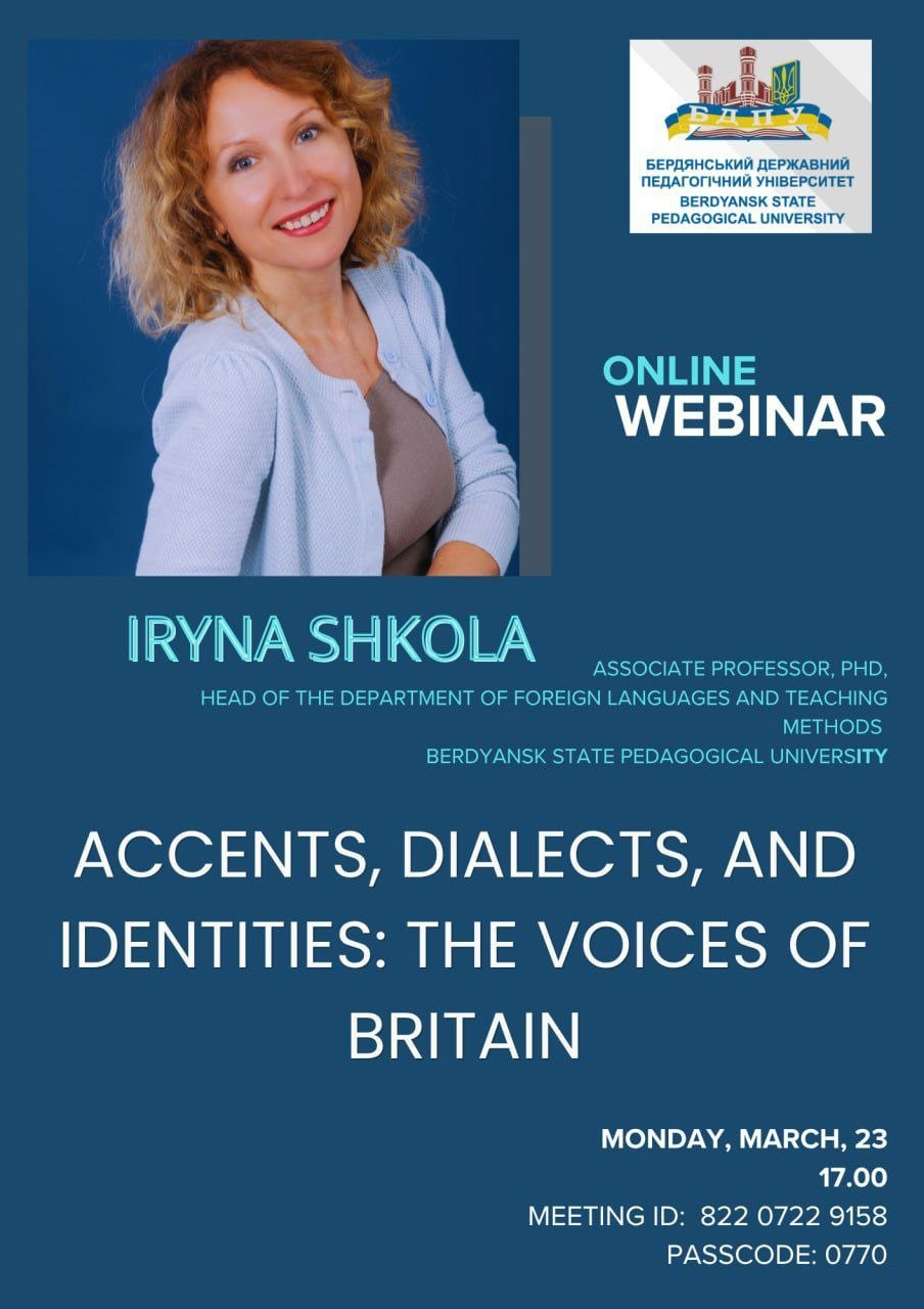 Лекторка – к. філол. н., доцент, завідувач кафедри іноземних мов і методики викладання Бердянського державного педагогічного університету пані Ірина Школа – ознайомила слухачів із різноманіттям британських діалектів та акцентів.