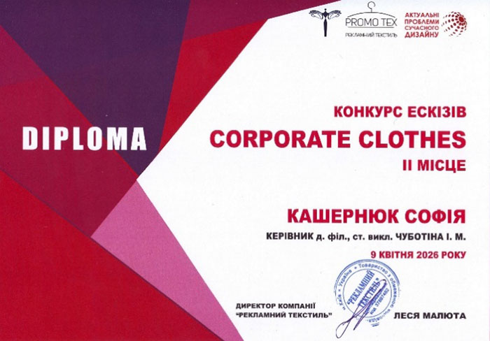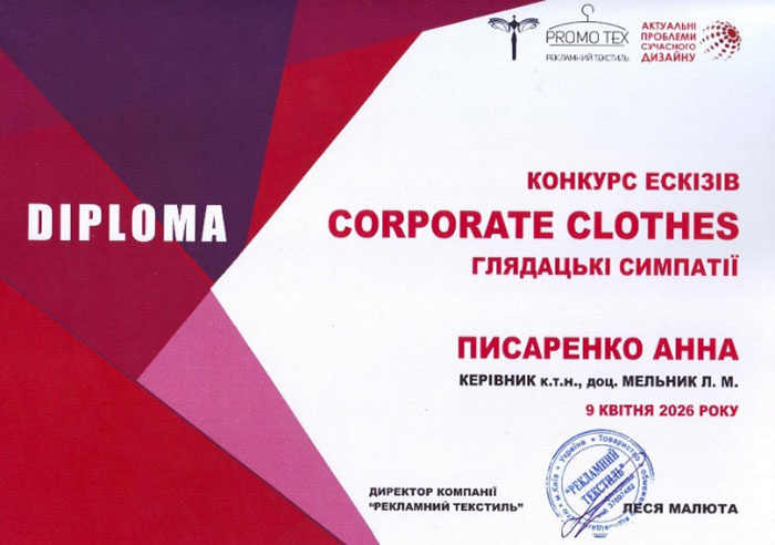 В рамках VІІІ Міжнародної науково-практичної конференції «Актуальні проблеми сучасного дизайну», що відбулася 9 квітня 2026 року в КНУТД, компанією «PROMO TEX», лідером ринку корпоративного текстилю та багаторічним партнером факультету дизайну КНУТД, було проведено конкурс ескізів одягу «CORPORATE CLOTHES».