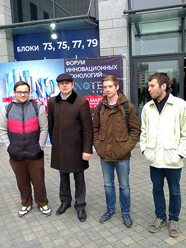 Студент гр МгМ -14, т.в.о. зав. каф. ПММ, доц. Манойленко О.П. та студенти гр. БМ-13 Полевий Р.І. та Куліш І.І. (фотозйомку виконує доц. каф. ПММ Ковальов Ю.А.) біля входу в виставковий зал НСК «Олімпійський».