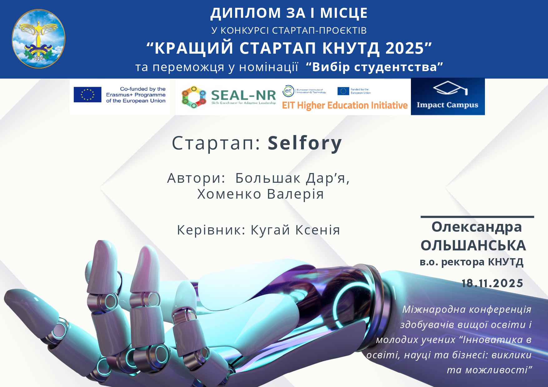Проходила стажування за кордоном: Сілезька політехніка, м. Глівіце (Польща). Національна конференція офісів академічної кар’єри, яка проводилася на базі Сілезької політехніки – 2023.
